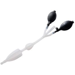 lekken of snel breken. Ik heb dat nog niet meegemaakt. Verder heb ik gelezen dat de pompen van slechte kwaliteit zijn en moeilijk te gebruiken zijn. Ik denk dat ze verderprima werken en zeer intuïtief zijn en ze kunnen gemakkelijk worden vervangen als je het nog steeds wilt gebruiken. Kortom, het product is van goede kwaliteit. De slangtussen de twee ballonnen is verstevigd zodat je de toevoer niet kunt afsluiten door de sluitspier samen te knijpen. Een "connector" wordt niet meegeleverd, maar datwas voor mij ook niet nodig. De slang is zo breed dat een standaard slang gebruikt voor klysma's er probleemloos in past. De pompen hebben twee standen: "Gesloten".Hierbij kan lucht in de ballonnen komen door op de pomp te drukken en waar er geen lucht weer uit kan. "Open", waar de lucht uit de ballonnen komt en dus ook nietkan worden opgeblazen. Als de ballonnen niet kunnen worden opgeblazen, draai dan aan de metalen knop op de pomp, aangezien je dan waarschijnlijk in de "verkeerdeinstelling" staat. Het fijne van dit product is dat je tijdens een klysma meer kunt ontspannen. Je hoeft niet constant te knijpen om het water binnen te houden. Als jeeen beetje ondeugend bent, dan kun je de controle aan iemand anders geven, die beslist dan wanneer je het water mag afsluiten. Zolang de ballon opgeblazen is kan er echt geenwater meer uit komen. Wees echter voorzichtig: als je probeert de ballon eruit te duwen terwijl deze is opgeblazen, dan is dat waarschijnlijk mogelijk, of je kunt hetmisschien zelfs opblazen. Het product heeft geen nare geur, scherpe randen of andere onaangename dingen. Problemen: 1: De kwaliteit van het product is niet helemaal top. Toenik het uit de verpakking haalde zaten er op sommige plaatsen hele kleine bruine verkleuringen. Helemaal aan het einde waar het water uitkomt, was de snede niet helemaal goedgemaakt. Er waren geen scherpe randen, maar aan de binnenkant van de slang zat wat overtollig siliconen dat niet volledig was verwijderd. 2: Het product is redelijk groot. Ikkan alleen maar de bovenste ballon inbrengen en dan kan het product eigenlijk niet verder. Bovendien liggen de twee ballonnen een beetje te ver uit elkaar denk ik. Deze tweeproblemen samen zorgen ervoor dat de ballonnen vaak niet heel dicht bij elkaar eindigen. Vrijwel al het werk wordt gedaan door de binnenste ballon, terwijl de buitenste balloneen hele centimeter van de anus hangt en helemaal niets doet. Sommige houdingen helpen hier echter bij, bijvoorbeeld op de knieën zitten met het hoofd naar beneden. 3: Omdathet product redelijk groot is, moet ik glijmiddel gebruiken om het voorzichtig in te kunnen brengen. Ik kan het makkelijk doen zonder glijmiddel, maar dan ben ik bang deballonnen te beschadigen.