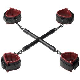 Gebruik de gewatteerde kunstleren pols- en enkelboeien om je partner vast te binden en creatief te zijn terwijl je beslist in welke positie je ze wilt plaatsen. De hogtie heeft de vorm van een X met O-ringen aan elk uiteinde om gemakkelijk te bevestigen aan de boeien - of andere bevestigingsaccessoires in jouw collectie.