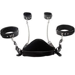 Geniet van nog meer kinky bondagesessies met de dubbele set dij- en enkelboeien om de benen van de onderdanige wijd open te houden. Kettingen en karabijnhaken worden gebruikt om de boeien te bevestigen aan een hoofdsteun achter de nek van de onderdanige, die is opgevuld voor extra comfort.